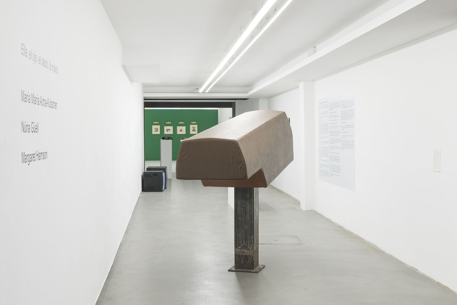 Ella, el ojo, el dedo, la mano dialoga entre una selección de obras de tres artistas de diferentes nacionalidades y generaciones: Margaret Harrison (1940, Wakefield, Reino Unido), María María Acha-Kutscher (1968, Lima, Perú) y Núria Güell (1981, Vidreres, España). A pesar de sus diferencias generacionales y contextuales, y de la especificidad y singularidad de sus obras, es fácil identificar enfoques, temas y líneas discursivas similares en las prácticas artísticas de estos tres creadores.