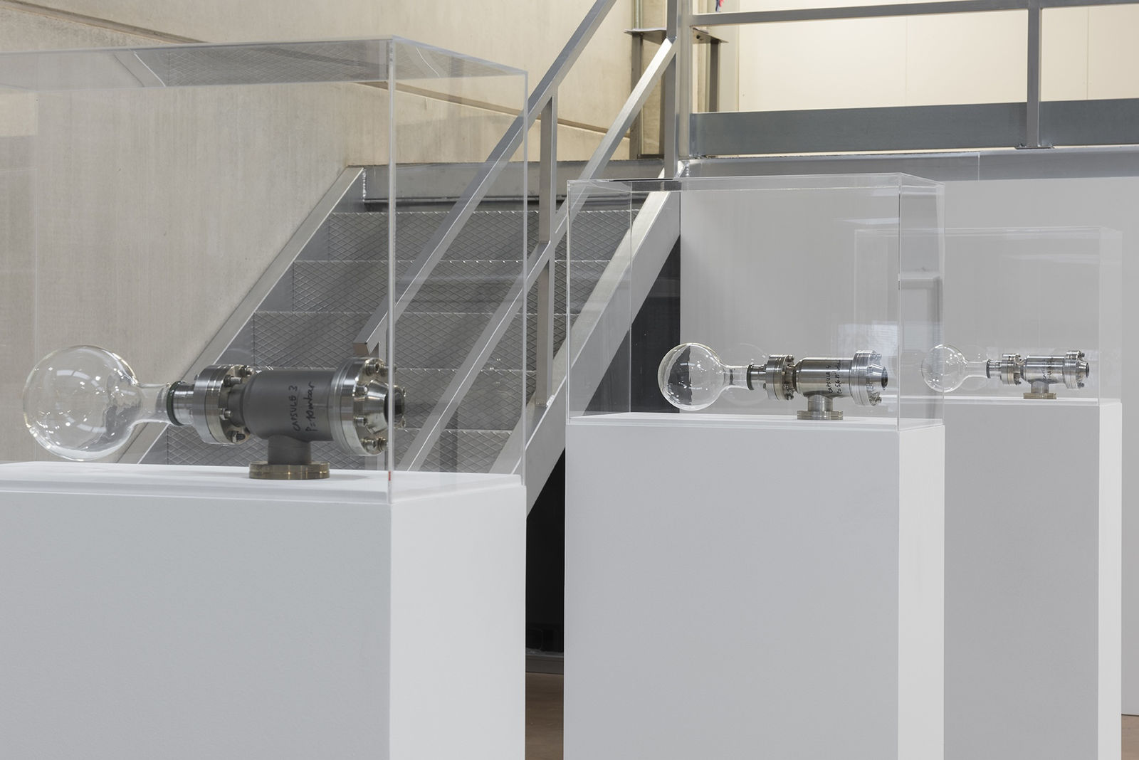 El artista logra introducirnos en la dimensión invisible de las partículas que componen la materia, enfatizando que los cambios infinitesimales son la base de la creación de sistemas (espacios donde se produce cualquier tipo de interacción). Para ello, Vidal diseña y construye cinco cápsulas, aparentemente iguales pero radicalmente diferentes, cada una con un grado de vacío diferente.